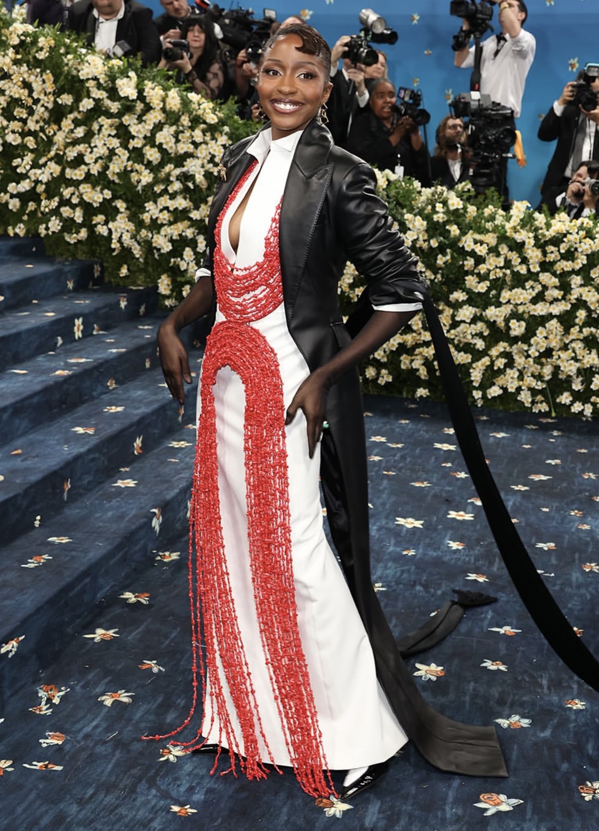 Ayo Edebiri owned one of fashion’s grandest stages with the same ease and enigma that define her on screen. At the 2025 Met Gala, she stunned in a tailored Ferragamo gown embroidered with red glass beads and a sleek black leather tailcoat, a look inspired by her father’s wedding outfit. The year before, she glided up the Met steps in a sculpted Loewe gown for the “Garden of Time” theme, a moment that cemented her as a fashion industry favourite.