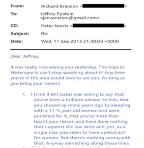 Richard Branson (CEO of the Virgin Group), whose spokesperson denied ever having full knowledge of Epstein’s actions yet offered Epstein tips on how to rehabilitate his public image through Bill Gates’ help in a 2013 email, citing the fact he (Epstein) slept with a 17 ½ year old woman and that “there’s nothing wrong with that.”